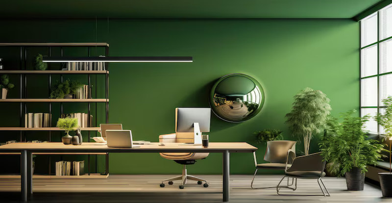 Sebaiknya pilih warna hijau yang tidak terlalu menyala agar memberikan ketenangan. Weldon Wallpaint, salah satu produk cat di Indonesia menyebutkan warna Surf Green sebagai salah satu produk mereka yang paling populer setiap tahunnya. Warna surf green ini memang cocok untuk ruang kantor atau ruang kerja karena memberikan warna calm dan relax.